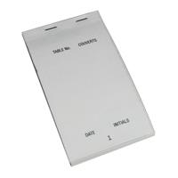 Service pad for use in restaurants cafes and takeaways. 50 numbered pages. 5.5 inch tear-off strip for orders. 1 inch counterfoil retained on pad for easy record. 50 carbonless copy slips for instant duplicate. Large pad size: 165x95mm.
