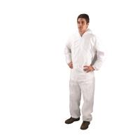 Non-woven polypropylene coverall with elasticated hood wrists ankles and waist. Zipped front fastening. Ideal for dirt protection farming decorating etc. Manufactured in accordance with European PPE directive 89/686/EEC. Size: X Large (46-50 in).
