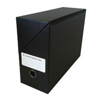Transfer case with frogmouth opening. Covered in wipe clean black paper. Cloth hinges for durability. Metal reinforced finger ring pull to spine. Index label. Dimensions: W130 x H260 x D370mm.