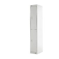Two door locker suitable for use in the office health education and dry area changing rooms. Fitted with deadlock and supplied with 2 keys per lock. Two compartments. Ventilated top and bottom. H1800 x W300 x D300mm. Colour: Light Grey.
