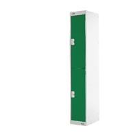 Two door locker suitable for use in the office health education and dry area changing rooms. Fitted with deadlock and supplied with 2 keys per lock. Two compartments. Ventilated top and bottom. H1800 x W300 x D300mm. Colour: Green.