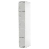 Five door locker suitable for use in the office health education and dry area changing rooms. Fitted with deadlock and supplied with 2 keys per lock. Five compartments. Ventilated top and bottom. H1800 x W300 x D300mm. Colour: Light Grey.