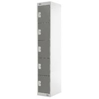 Five door locker suitable for use in the office health education and dry area changing rooms. Fitted with deadlock and supplied with 2 keys per lock. Five compartments. Ventilated top and bottom. H1800 x W300 x D300mm. Colour: Dark Grey.