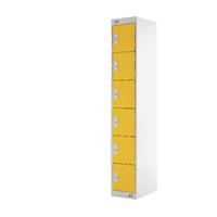 Six door locker suitable for use in the office health education and dry area changing rooms. Fitted with deadlock and supplied with 2 keys per lock. Six compartments. Ventilated top and bottom. H1800 x W300 x D300mm. Colour: Yellow.