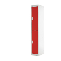 Two door locker suitable for use in the office health education and dry area changing rooms. Fitted with deadlock and supplied with 2 keys per lock. Two compartments. Ventilated top and bottom. H1800 x W300 x D450mm. Colour: Red.
