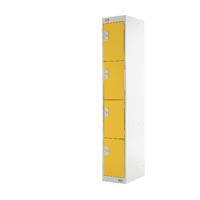 Four door locker suitable for use in the office health education and dry area changing rooms. Fitted with deadlock and supplied with 2 keys per lock. Four compartments. Ventilated top and bottom. H1800 x W300 x D450mm. Colour: Yellow.