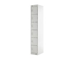 Six compartment solid door locker suitable for use in health education and dry area changing rooms. Fitted with deadlock and supplied with 2 keys per lock. Ventilated at the top and bottom.H1800 x W300 x D300mm. Light Grey.