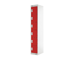 Six compartment solid door locker suitable for use in health education and dry area changing rooms. Fitted with deadlock and supplied with 2 keys per lock. Ventilated at the top and bottom.H1800 x W300 x D300mm. Colour: Red.