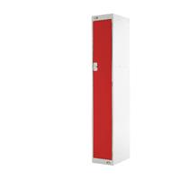 Single compartment solid door locker suitable for use in health education and dry area changing rooms. Fitted with deadlock and supplied with 2 keys per lock. Hat shelf and double coat hook. Ventilated. H1800 x W300 x D450mm. Colour: Red.