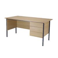 Spacious desk with modesty panel and 18mm thick MDF desktop. Rectangular shape allows you to fit together multiple desks. Sturdy metal legs. Supplied with one three drawer lockable pedestal. Size: W1800 x D750 x H730mm. Finish: Ferrera Oak.