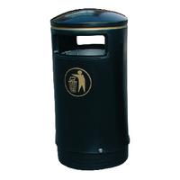 Removable body for ease of emptying. Hooded top prevents ingress of rainwater. Complete with inner liner lock and base. Capacity 75L. H1000x 485mm. Optional concrete base 3 parts. Optional fixing plate. Black Gold. Non returnable.