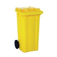 Tough and durable bin made from UV stabilised polyethylene for longer life. 2 wheel bin. Capacity 120 litres. W480 x D555 x H930mm. Yellow. Non returnable.