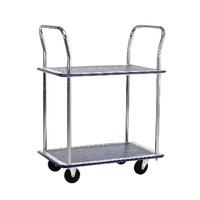 Two shelf trolley with a chrome finish frame and pressed steel shelves with a non slip surface and scuff resistant corners. Fitted with 100mm non marking wheels. Maximum weight capacity: 120kg. Dimensions: W470 x D725 x H950mm.