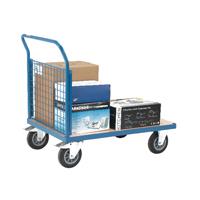 Heavy duty tubular steel welded trucks. Single mesh ended. Capacity - 500kg. Powder coated metalwork. 2-fixed/2-swivel 200mm diameter rubber tyred castors (swivel castors fitted with brakes). Overall L1120x W700xH270mm. Non returnable.