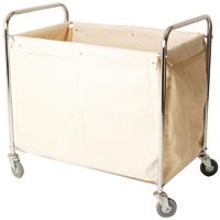 Tubular steel frames. Powder coated silver finish. Cream linen bags with snap hooks. On 4 x 100mm diameter rubber tyred swivel castors. H910 x W560 x L790mm. Non returnable.