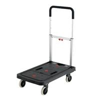 Plastic platform with integral handle including castors which fold underneath the platform for compact storage. Telescopic handle with three height positions. Comfort grip handle for positive grip. Overall size: W410 x D680 x H920mm. Capacity 120kg.