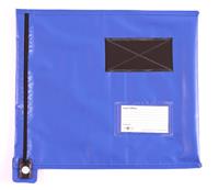 Flat Mailing Pouches. Tamper evident pouch ideal for secure low volume mailing of large items. Manufactured from heavyweight durable PVC coated material with internal entry address window and label patch. W355 x H381mm. Colour - Blue.