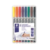 Pen for OHP film and other glossy surfaces. Medium tip 1.0mm. Water-soluble. Dry-Safe ink for up to 2 days cap-off time. Fast drying ink prevents smudges. Colour: Assorted. Pack of 8 pens in rigid wallet.