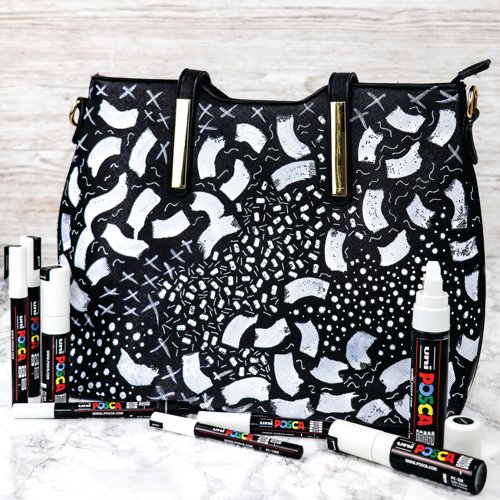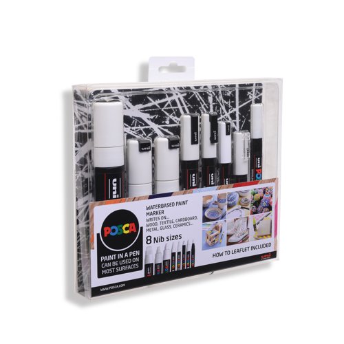 - POSCA paint markers are excellent multi-surface, creative pens. The uni POSCA paint marker contains water-based pigment ink which is lightfast, water-resistant and will write on almost any surface. The POSCA markers are permanent markers on paper, card and wood and can be made permanent on various other surfaces including terracotta, porcelain, glass, textiles, metal, plastic and wood. These multi-use marker pens are available in a number of vibrant, opaque solid colours which can be mixed while the paint is wet and overlay colours on top of one another when they dry. Excellent for customisation, up-cycling, illustration, posters, fine art or sign-writing. Supplied in a pack of 8 pens in assorted nib sizes.