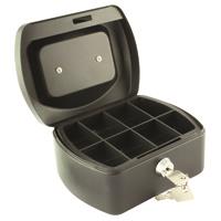 Six inch cash box with removable tray compartment. Supplied with two keys. Ideal for storing valuables and cash. Dimensions - 152x120x80. Colour - Black.