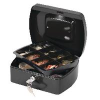 Eight inch cash box with removable tray compartment. Supplied with two keys. Ideal for storing valuables and cash. Dimensions - 205x160x90mm. Colour - Black.