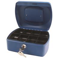 Eight inch cash box with removable tray compartment. Supplied with two keys. Ideal for storing valuables and cash. Dimensions - 205x160x90mm. Colour - Blue.