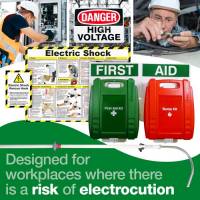| Includes a British Standard Compliant First Aid Kit, a Burn Stop Burns Kit, a Sign, an Electric Shock Guidance Poster and an Electric Shock Rescue Hook (suitable for installations of up to 45kV) |
