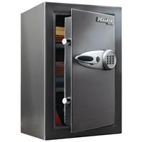Home/Office dual locking safe manufactured from solid steel. Features electronic lock and 6-lever override key lock 2 carpeted shelves concealed hinges door back hooks carpeted floor and door back. Internal: W384 x D295 x H569mm. Non returnable.