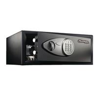 Sentry large X075ML security safe with electronic lock with override key. Features 2 live locking bolts carpeted floor and bolt down kit. Fits most laptops. Exterior dimensions: W430 x D370 x H180mm. Interior dimensions: W426 x D320 x 176mm. Black.