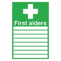 Space to fill in names phone numbers and locations of first aiders. Keep employees informed in case of accidents. Self-adhesive backing. Dimensions: 300x200mm (HxW). Colour: Green and White.