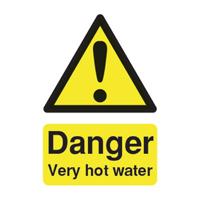 PVC warning sign indicating Very Hot Water. Universal symbol and colour scheme. For use in washrooms and kitchens. Keep employees informed to prevent injuries. Durable PVC easily mounted to walls. Dimensions: 75x50mm (HxW). Colour: Yellow and Black.