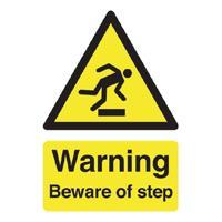 Self-adhesive sign warning of potential trip hazards. Universal symbol and colour scheme. Keep employees informed to prevent accidents. Self-adhesive backing - no need for tools. Reads: Warning Beware of Step. Size: A5. Colour: Yellow and Black.