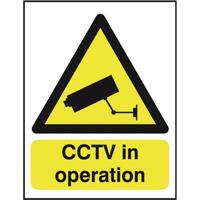 PVC CCTV in Operation sign. Instantly recognisable. Designed to discourage and deter criminal activity. Durable PVC suitable for indoor and outdoor use. Can be fixed to a variety of surfaces. Size: A5. Colour: Yellow and Black.