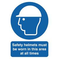 PVC sign informing employees and others that they need to wear safety helmets. Keeps employees and visitors safe. Durable PVC. Reads: Safety Helmets Must Be Worn in This Area at All Times. Size: A4. Colour: Blue and White.