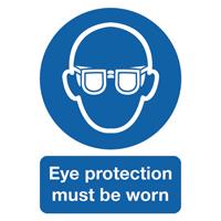 PVC sign informing employees and others that they need to wear eye protection. Keeps employees and visitors safe. Durable PVC easily mounted to walls and doors. Reads: Eye Protection Must Be Worn. Size: A4. Colour: Blue and White. Pack of 1 sign.
