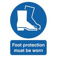 PVC sign informing employees and others that they need to protect their feet. Keeps employees and visitors safe. Durable PVC easily mounted to walls and doors. Reads Foot Protection Must Be Worn. Size: A4. Colour: Blue and White. Pack of 1.